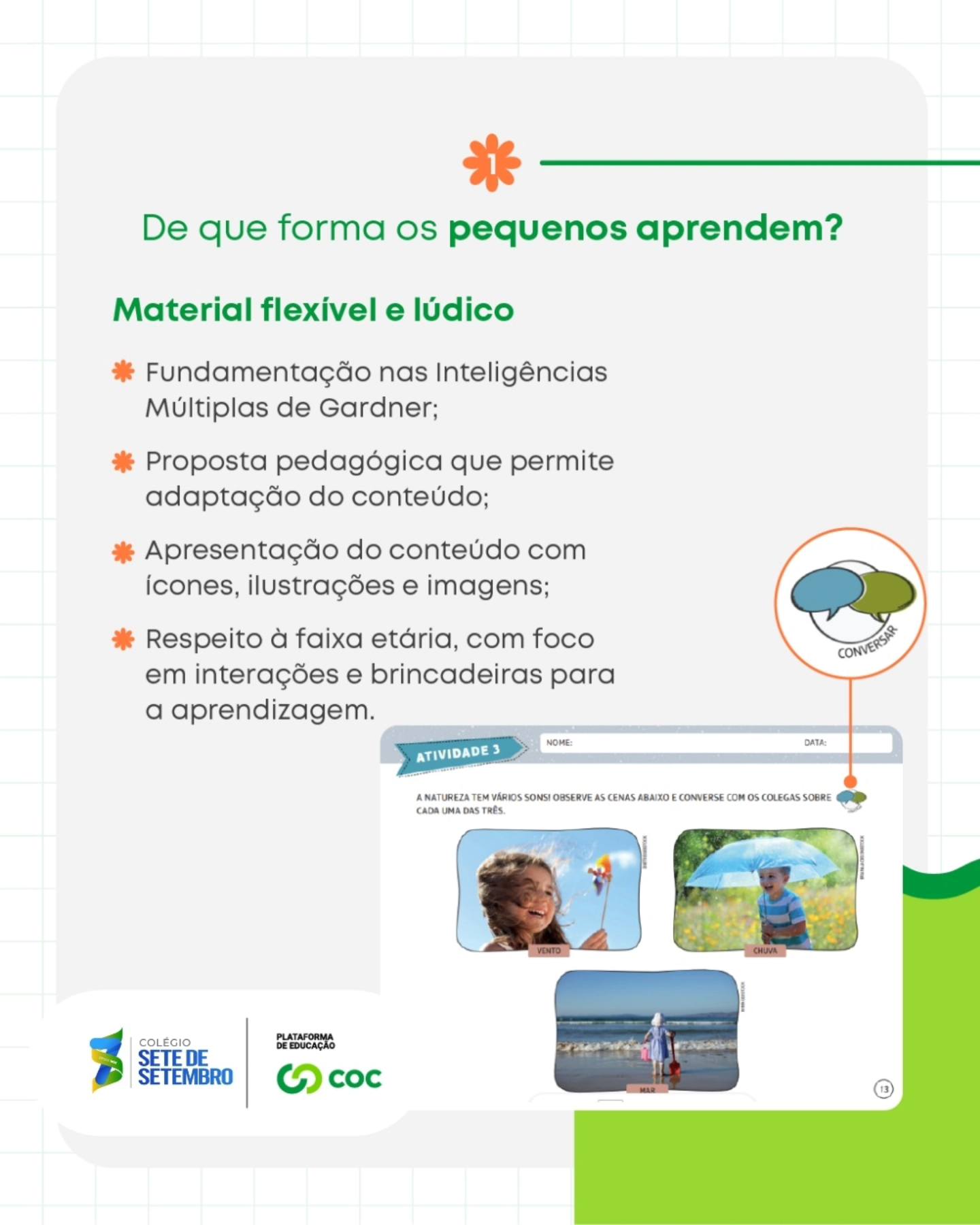 Com uma proposta lúdica, flexível e baseada nas Inteligências Múltiplas de Gardner, o Colégio Sete de Setembro/COC valoriza o desenvolvimento integral dos pequenos por meio de interações, brincadeiras e experiências significativas.